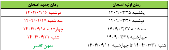 • امتحانات برنامه ریزی شده در بازه یکشنبه 1404/03/25 تا چهارشنبه 1404/03/28 در همان ساعت اعلام شده، اما در تاریخ جدید مطابق جدول زیر برگزار خواهد شد.