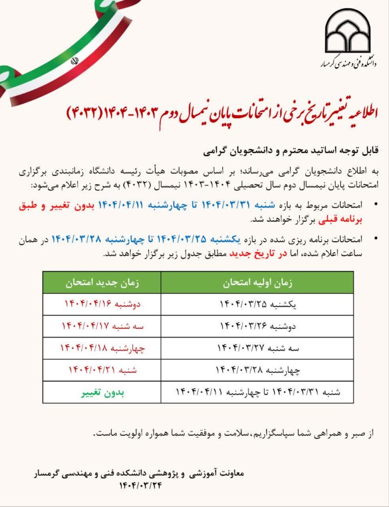 اطلاعیه تغییر تاریخ برخی از امتحانات پایان نیمسال دوم 1404-1403 (4032)