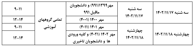 تنها و تنها دانشجویانی که در نیمسال پایانی خود به سر می برند (حداکثر ۲۴ واحد درسی آنان باقیمانده باشد.) در صورت اخذ کل ۲۴ واحد خود در نیمسال 4022، می توانند در صورت عدم ارائه گروه های درسی بدون تداخل، از تسهیلات اخذ درس به صورت تداخل ساعت کلاس درسی بهره مند گردند که بدین منظور بایستی حضورا به اداره آموزش مراجعه نمایند.