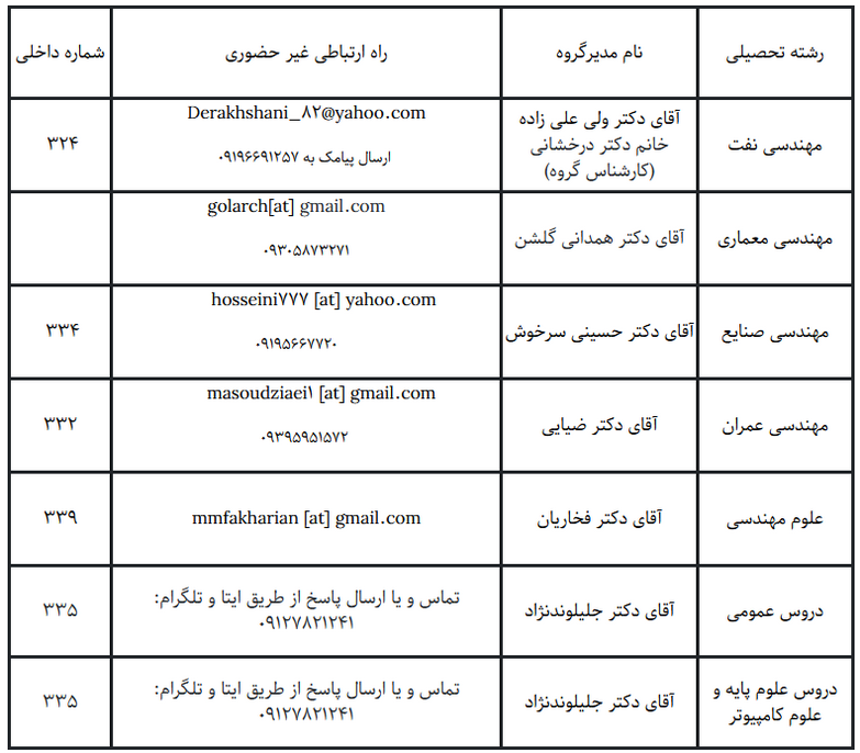 راه ارتباطی با مدیران گروه های آموزشی به شرح ذیل می باشد. همچنین تمامی مدیران گروه های آموزشی در روزهای انتخاب واحد و حذف و اضافه موظفند در اتاق مدیران گروه های آموزشی حضور داشته باشند.