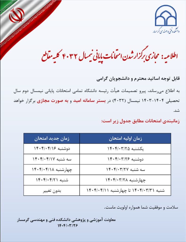 به اطلاع می رساند، پیرو تصمیمات هیات رئیسه دانشکده تمامی امتحانات پایانی نیمسال دوم سال تحصیلی 1404-1403 نیمسال (4032) در بستر سامانه امید و به صورت مجازی برگزار خواهد شد.