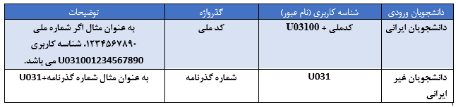 در هنگام ثبتنام در سامانه گلستان برای وارد کردن شناسه کاربری و رمز عبور مطابق زیر عمل نمایید: