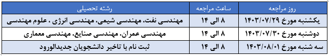 *** پذیرفته شدگان موظف هستند پس از تکمیل و اتمام مراحل ثبت نام اینترنتی و بارگذاری تصاویر مدارک شناسایی، تحصیلی، تعهدنامه ها و فرمهای خود، اصل مدارک تحصیلی، اصل و تصویر مدارک شناسایی و فرم های پرینت گرفته شده از ثبت نام اینترنتی خود را در زمان های تعیین شده برای ثبت نام حضوری طبق زمانبندی زیر تحویل دانشگاه نمایند.