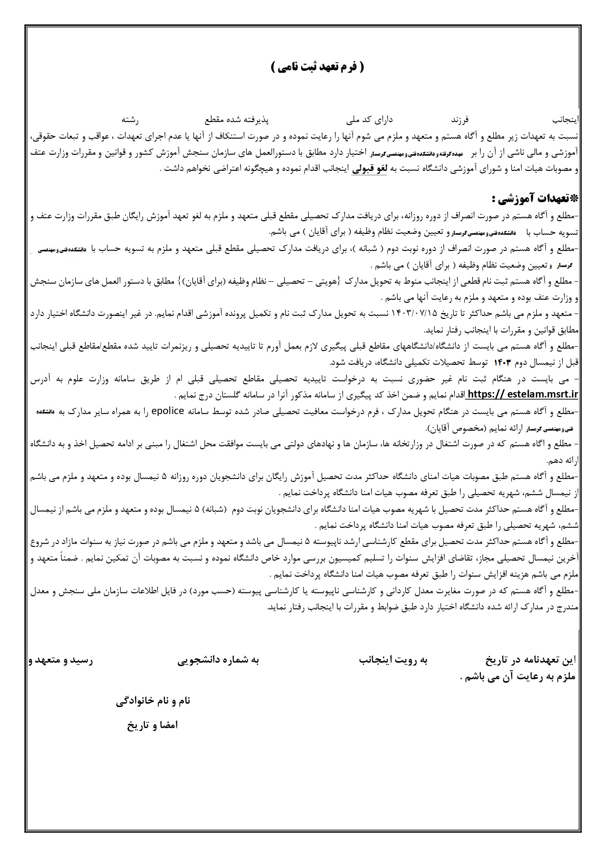 -فرمهای امضا شده سامانه گلستان برابر راهنما سامانه و فرم تعهد