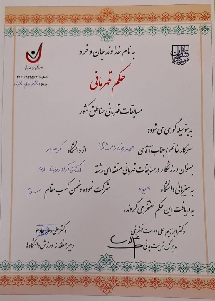 به گزارش روابط عمومی دانشگاه گرمسار، این دوره از مسابقات منطقه ۹ کشور در شهرهای بیرجند- بجنورد- و تربت جام برگزار گردید و در رشته کشتی وزن ۹۷ کیلو محمد رضا راشدی موفق شد مقام سوم این دوره از مسابقات را کسب نماید.