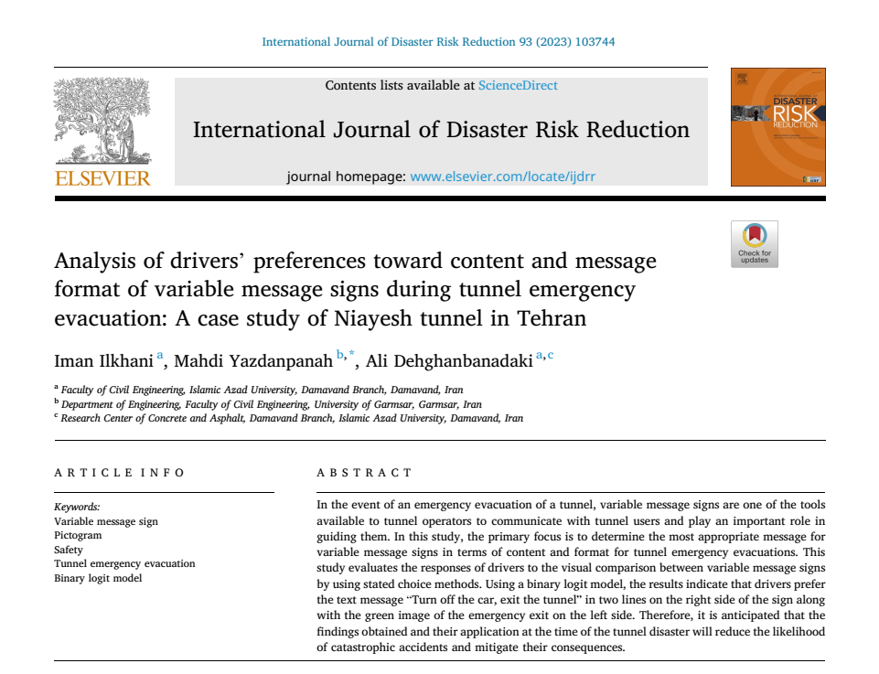 مقاله جناب آقای دکتر مهدی یزدانپناه با عنوان “تحلیل ترجیحات رانندگان نسبت به محتوا و قالب پیام تابلوهای پیام متغیر در هنگام تخلیه اضطراری تونل: مطالعه موردی تونل نیایش تهران” و همکاری جناب آقای مهندس ایلخانی و جناب آقای دکتر دهقان در مجله International Journal of Disaster Risk Reduction با ضریب تاثیر 5 و رتبه جی سی آر Q1 به چاپ رسیده است.