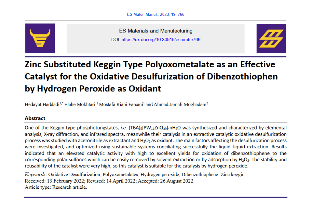 مقاله جناب آقای دکتر احمد جمالی مقدم با موضوع بررسی خاصیت کاتالیزوری در واکنش های حذف گوگرد با استفاده از کاتالیست خوشه ای اکسیژن تنگستات در گوگرد زدایی از دی بنزوتیوفن ها به چاپ رسید.