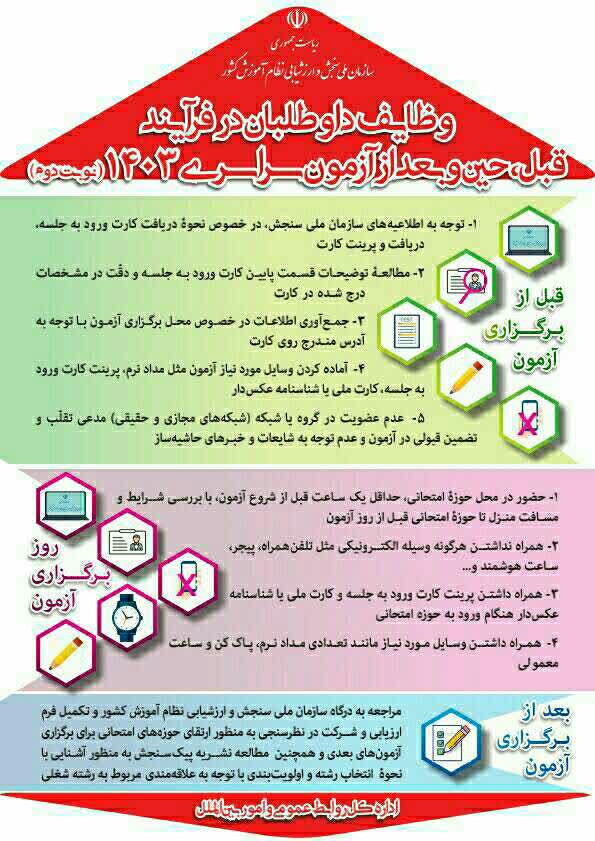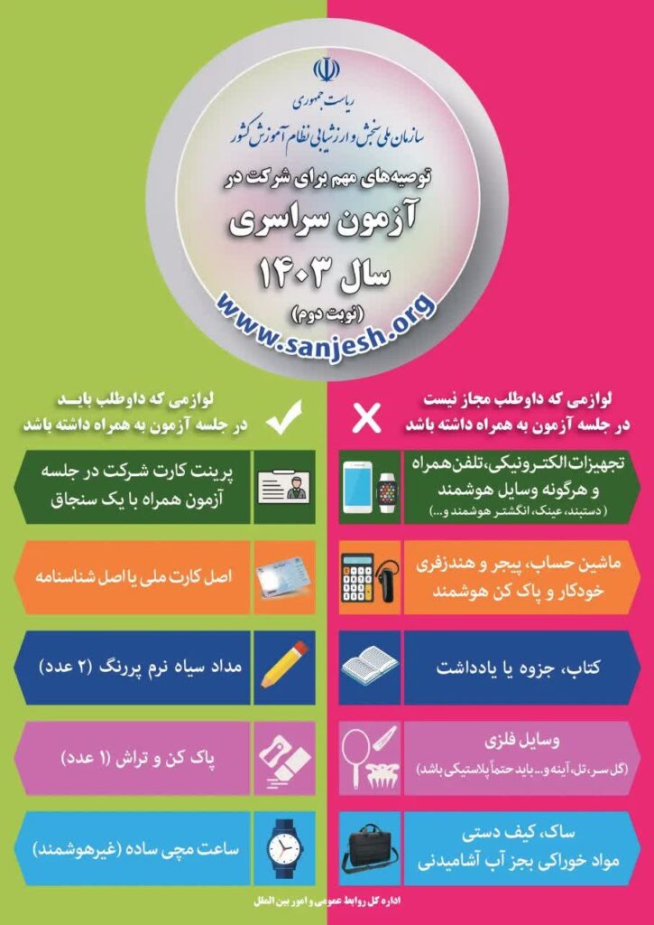 اینفوگرافیک توصیه های مهم برای شرکت در آزمون سراسری سال ۱۴۰۳ (نوبت دوم)
