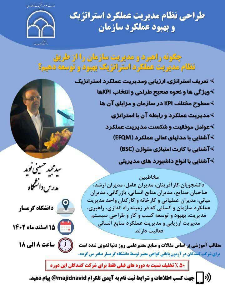 دانشگاه گرمسار در نظر دارد یک دوره آموزشی حضوری یک روزه با عنوان ”طراحی نظام مدیریت عملکرد استراتژیک و بهبود عملکرد سازمان“ را برای مخاطبین زیر برگزار کند :
