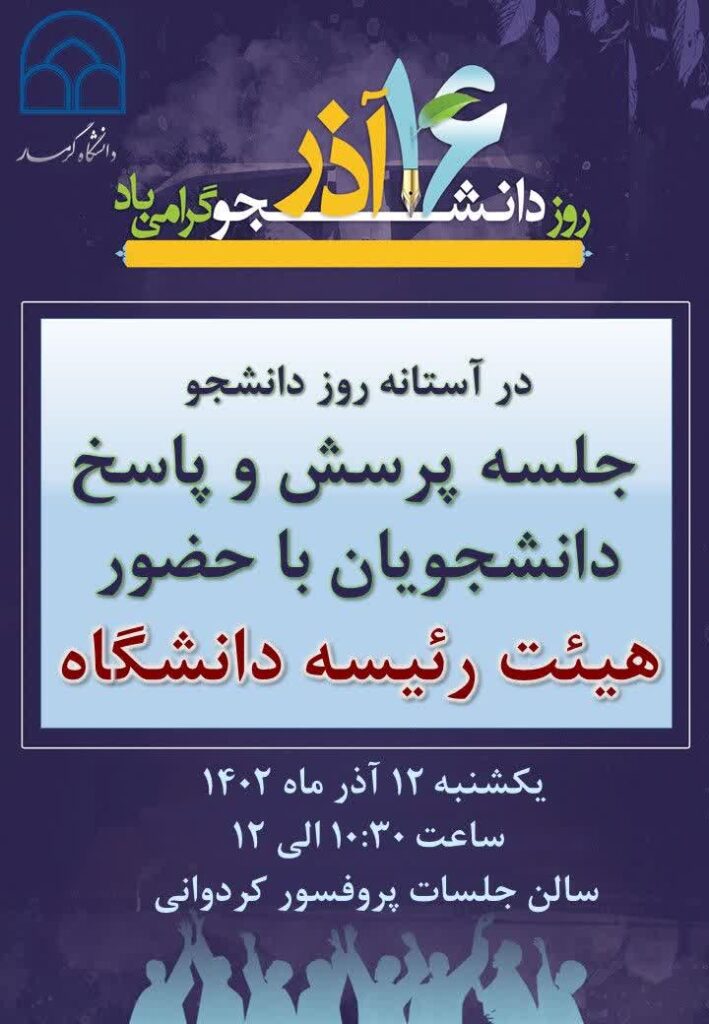 به اطلاع کلیه دانشجویان محترم می رساند این دانشگاه در نظر دارد به مناسبت روز دانشجو نسبت به برگزاری جلسه پرسش و پاسخ دانشجویان با حضور هیات رئیسه دانشگاه در محل ساختمان مرکزی دانشگاه، سالن کنفرانس زنده یاد پروفسور پرویز کردوانی روز یکشنبه مورخ 12 آذر ماه 1402 راس ساعت 10:30 الی 12 اقدام نماید. لذا از دانشجویان محترم دعوت به عمل می آید در این نشست حضور بهم رسانند.