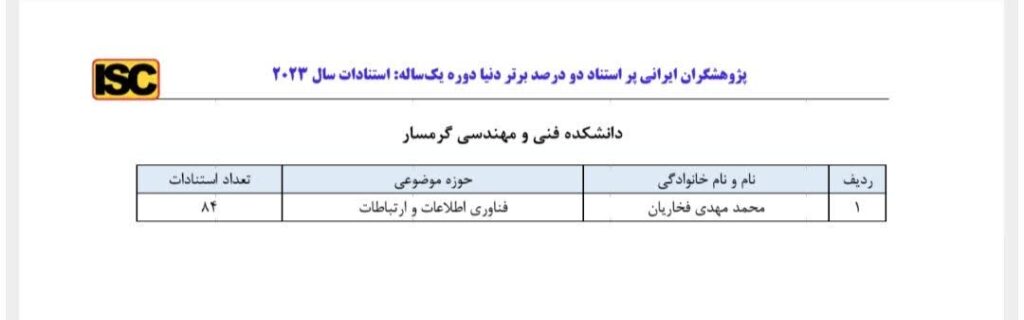 برای اولین بار طی ۱۳ سال اخیر نام دانشکده فنی و مهندسی گرمسار نیز جزو لیست دانشمندان پر استناد ۲ درصد برتر دنیا قرار گرفت.