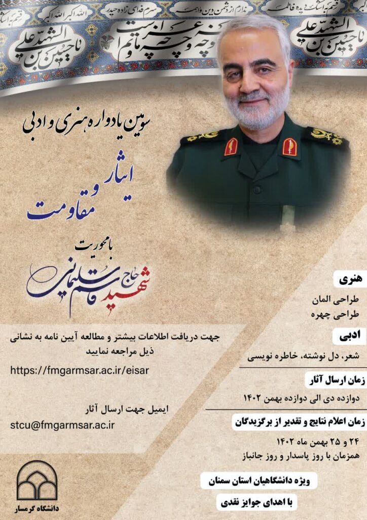 معاونت دانشجویی و فرهنگی دانشگاه گرمسار به مناسبت بزرگداشت سالروز شهادت شهید حاج قاسم سلیمانی برگزار می نماید: