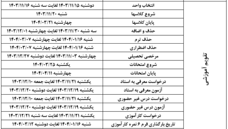 بدینوسیله تقویم آموزشی نیمسال دوم تحصیلی 04-1403 جهت اطلاع کلیه دانشجویان دانشگاه اعلام می گردد. *** توجه: دانشجویانی که در بازه زمانی انتخاب واحد، درس کارآموزی خود را اخذ نموده اند باید نسبت به ثبت تمامی مراحل کارآموزی خود در پیشخوان خدمت نیز اقدام نمایند. امید است دانشجویان محترم برابر زمان بندی اعلام شده از