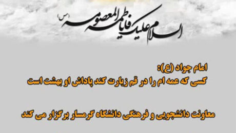 معاونت دانشجویی و فرهنگی دانشگاه گرمسار به مناسبت میلاد حضرت معصومه (ص) و روز دختر برگزار می نماید : اردوی زیارتی قم ویژه دانشجویان دختر به استحضار می رساند دانشجویان متقاضی شرکت در اردوی مذکور تا روز چهارشنبه مورخ 19 اردیبهشت فرصت دارند نسبت به ثبت نام اقدام نمایند. زمان برگزاری اردو: یکشنبه مورخ 23