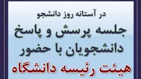 به اطلاع کلیه دانشجویان محترم می رساند این دانشگاه در نظر دارد به مناسبت روز دانشجو نسبت به برگزاری جلسه پرسش و پاسخ دانشجویان با حضور هیات رئیسه دانشگاه در محل ساختمان مرکزی دانشگاه، سالن کنفرانس زنده یاد پروفسور پرویز کردوانی روز یکشنبه مورخ 12 آذر ماه 1402 راس ساعت 10:30 الی 12 اقدام نماید.