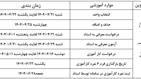 به اطلاع دانشجویان گرامی می رساند: با توجه به شرایط و رفع مشکلات دانشجویانی که واحد کارـموزی را در موعد مقرر اخذ نموده ولی درخواست پیشخوان خود را کامل ننموده اند تاریخ درخواست در پپیشخوان تا 1404/05/07 تمدید گردید.