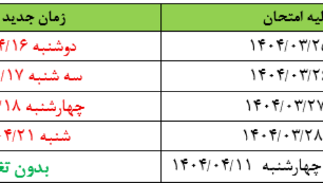قابل توجه اساتید محترم و دانشجویان گرامی به اطلاع می رساند، پیرو تصمیمات هیات رئیسه دانشکده تمامی امتحانات پایانی نیمسال دوم سال تحصیلی 1404-1403 نیمسال (4032) در بستر سامانه امید و به صورت مجازی برگزار خواهد شد. زمانبندی امتحانات مطابق جدول زیر است. سلامت و موفقیت شما همواره اولویت ماست. راهنمای ویدیویی امتحانات را از